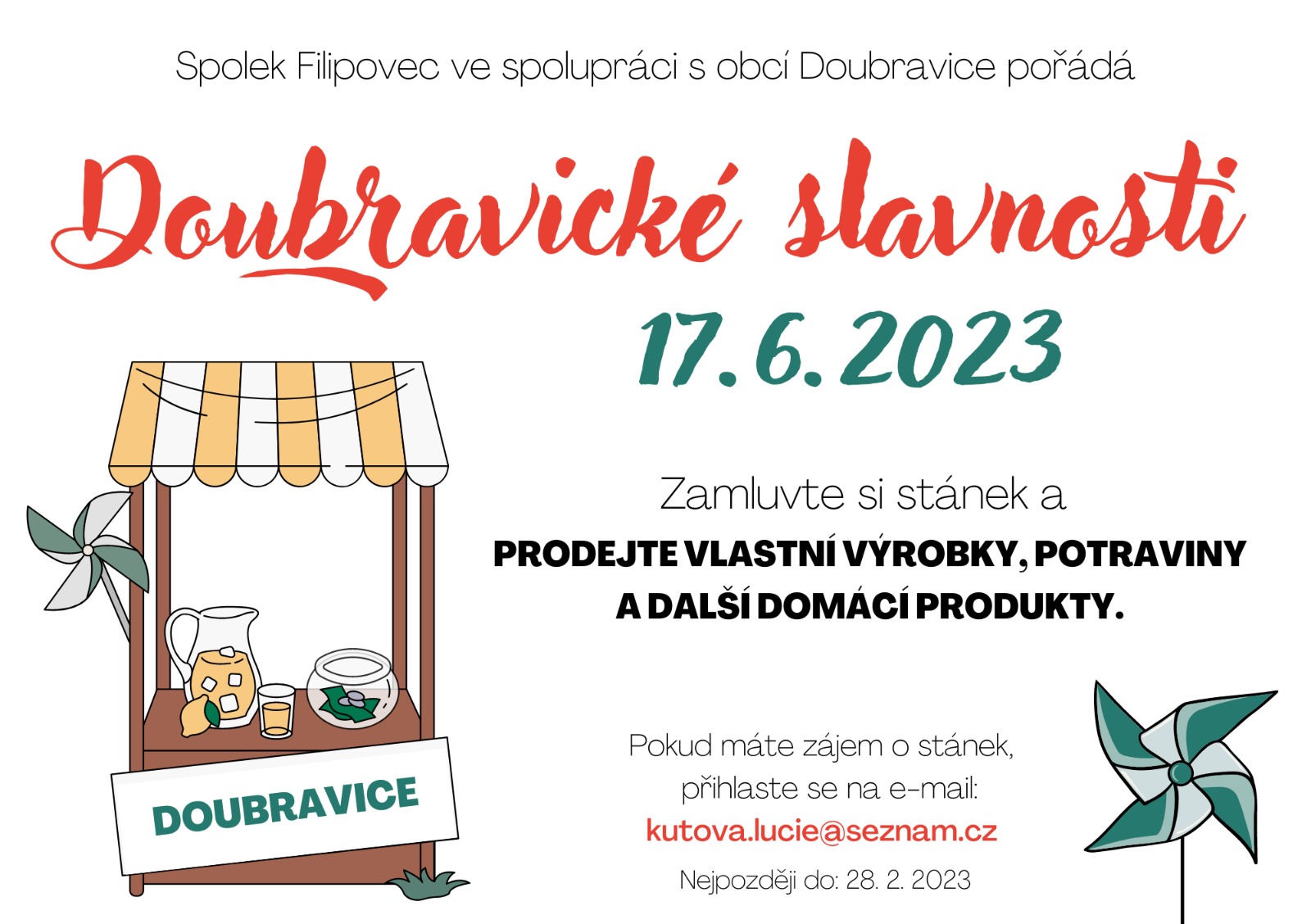 ve dnech 16.-17.6.2023 bude v Doubravici probíhat první ročník Doubravických slavností spojených s tradičním Doubravickým divadelním dnem. Doubravické slavnosti budou probíhat 17.6.2023 a kromě divadelních představení, bude připraven pro zúčastněné také bohatý celodenní a celovečerní kulturní program. Podrobnosti o programu, který zatím připravujeme zveřejníme později, ale máte se na co těšit!