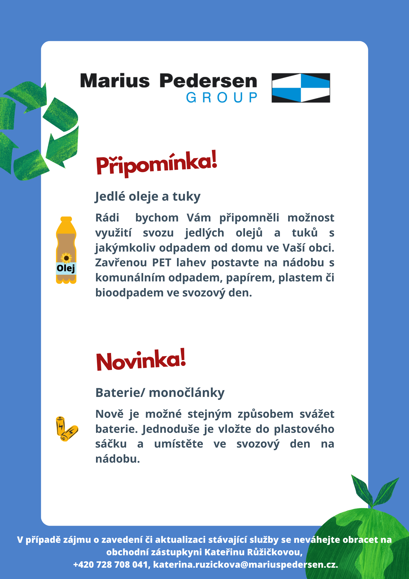 nově je možné využít i v naší obci služby svozu jedlých olejů, tuků a baterií jednoduše se svozem komunálního odpadu. Více podrobnosti naleznete na letáku níže.
