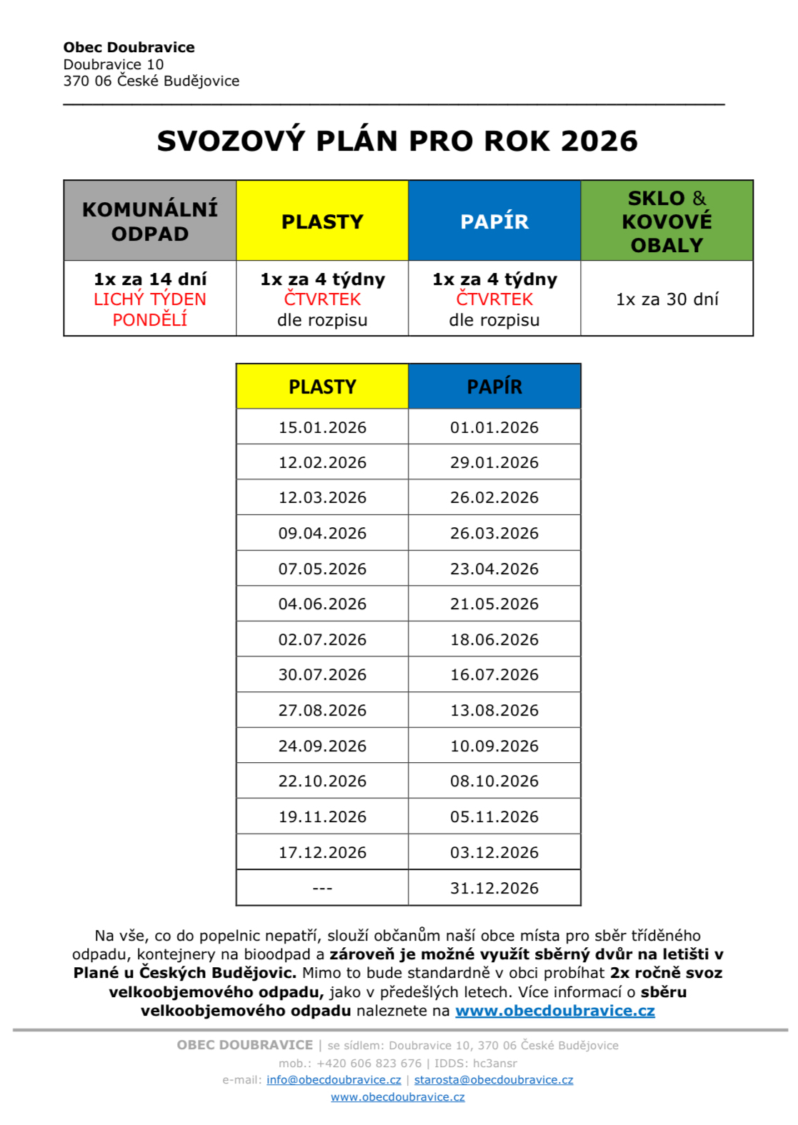 i když jsou informace ohledně svozu odpadů pro rok 2026 zveřejněny již od 10. 12. 2025 na webových stránkách obce a na vývěskách, rádi bychom Vám tuto skutečnost ještě jednou připomněli.